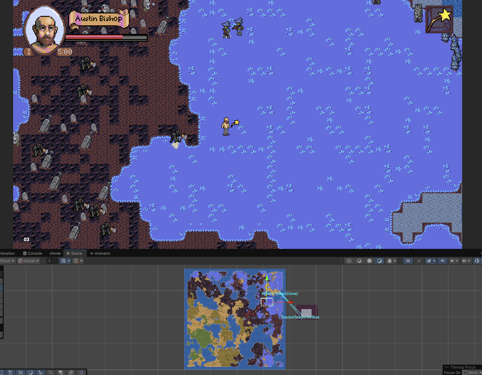 I think I fell incredibly short on understanding how long specific tasks would take. I don't really code enemy AI much anymore since I started working with Jacob and I just kind of assumed with leveraging TopDownEngine we could reskin and reuse most of the enemies really quickly. My during jam solution to the scope problem was to make some generic enemies and generation then move on quickly so we could get to 'the meat' of the actual death mechanics. So I set a break neck timeline of implementing six to seven unique enemy AIs in about 24 hours. This was the most egregious example, but I just didn't realize that was not possible and if I had just asked Jacob and Ian for time estimates or potentially enacted time-cutoffs, to stop coding such and such after this time, then we could've avoided a lot of the scope issues.
