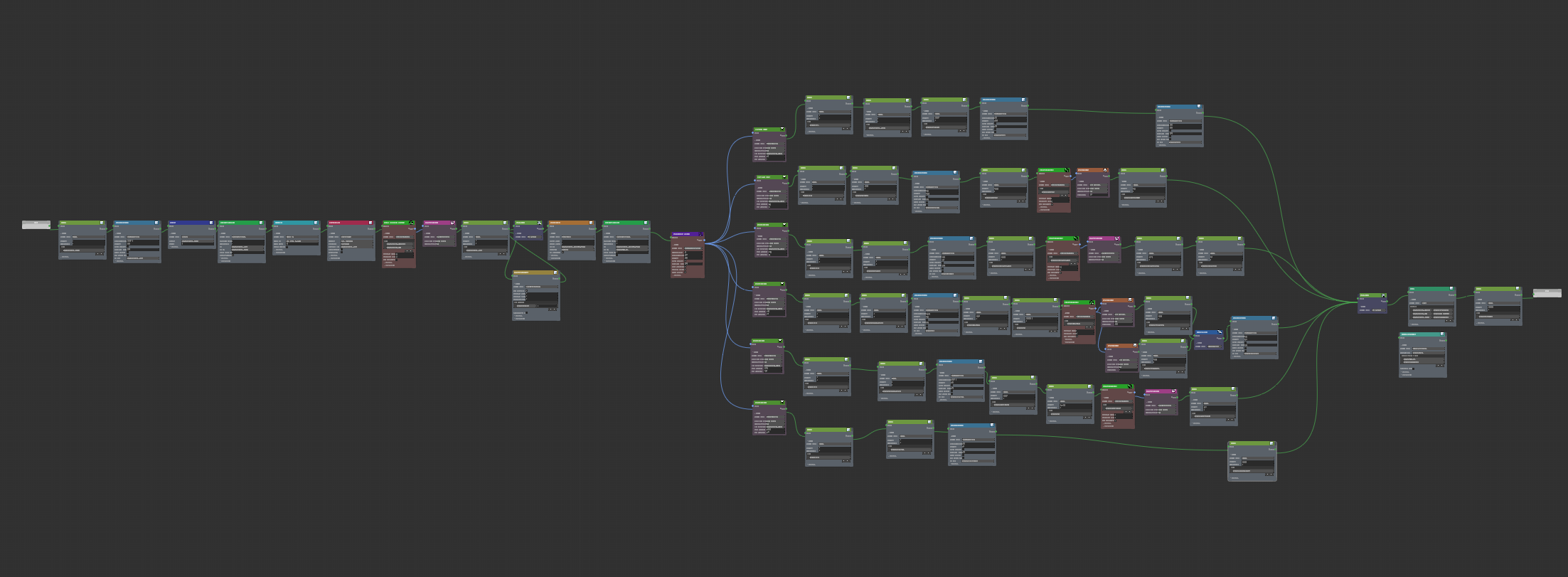 Simply put, the introduction of XNode and graphs in conjunction with new node operations such as splitters, filters and joiners worked to enable the generation of maps with regions. To come full circle, the real world application of this is readily playable on my itch in the form of the recent GMTK 25 Jam Submission my team and I made. The graph that I ended up making for that game jam had over 70 different nodes and was 384 x 384 tiles large, a total of 147,456 per layer and with four layers per tile, a total of 589,824 different tile types generated in less than three seconds in a browser- proving the system could handle production-scale complexity under jam constraints. Having just looked at some other graphs in the traversal section, look at the behemoth we ended up using.