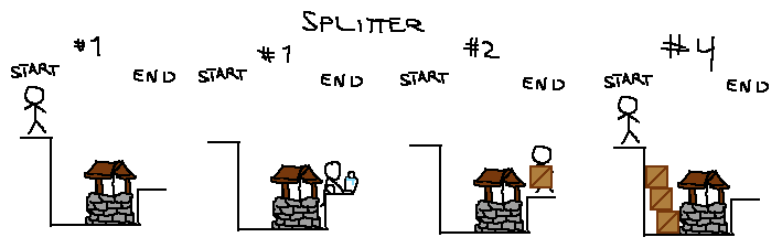 Well I like to think of splitters as something a little bit more complicated, imagine a ledge you can get down, but not back up that also has a well at the bottom.