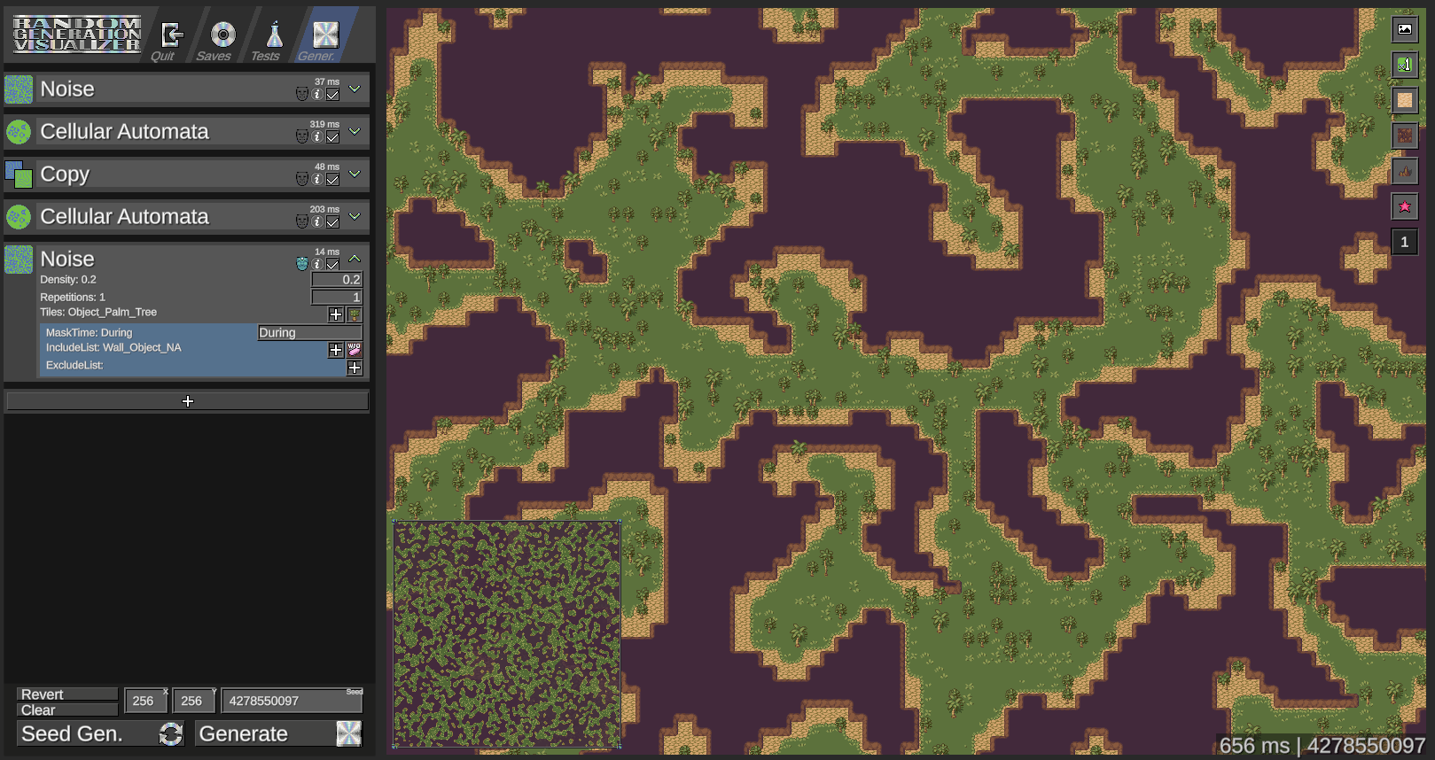 Generator - The algorithm used to place or modify tiles on an existing tile grid. An example would a noise generator, which the user gives a tile i.e. grass, and it places it at a random amount, outputting something visually similar to a grassy TV static.