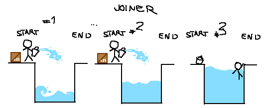 So each time you get to the joiner, you bring a bucket of water and fill up the pit a little bit more. When the pit is full, you swim across easily. But where does the water come from?